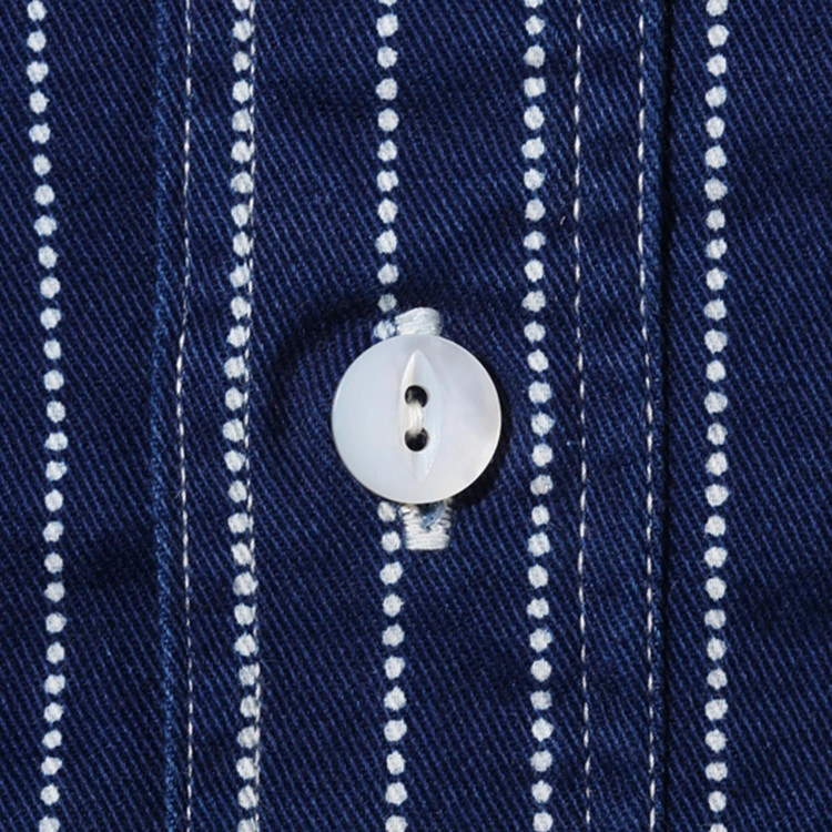 인디고 염색한 8.5온즈 원단에 스트라이프 형태로 발염하여 제작된 와바시 스트라이프 원단을 사용합니다.