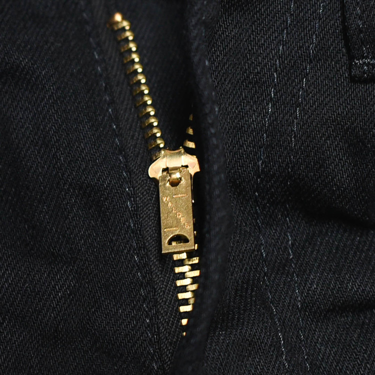 전면의 둥근 포켓과 프론트의 스냅 버튼, UFO 리벳이, 지퍼 플라이가 특징으로