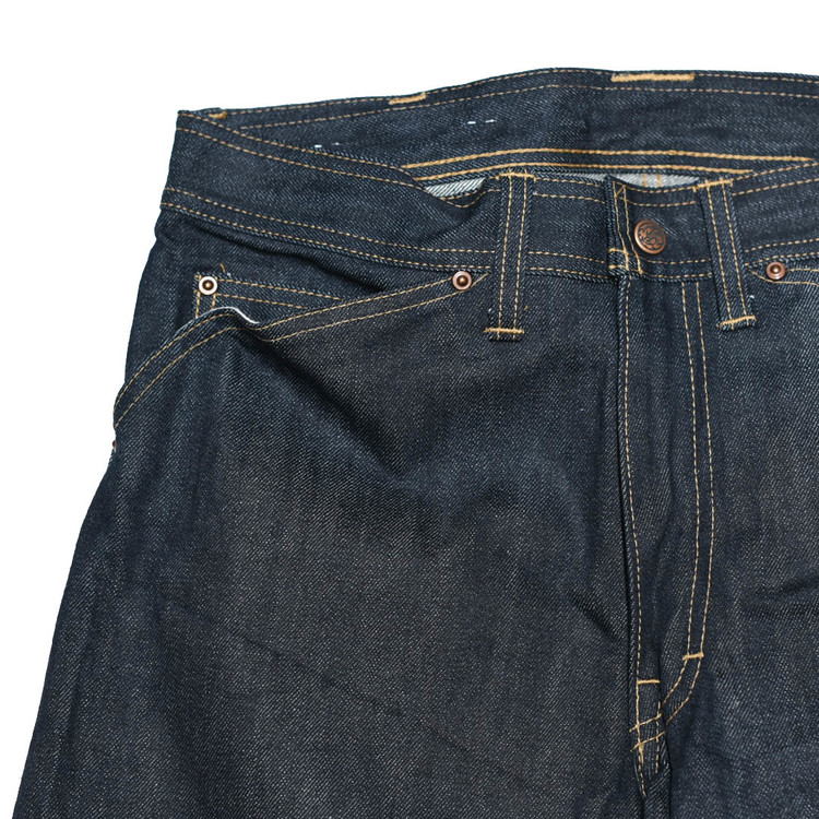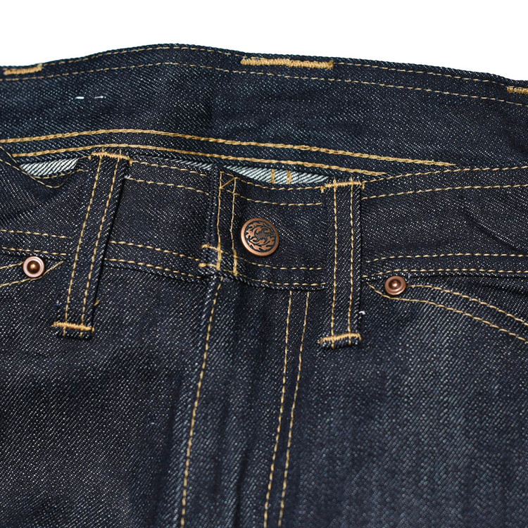 전면의 둥근 포켓과 프론트의 스냅 버튼, UFO 리벳이, 지퍼 플라이가 특징으로