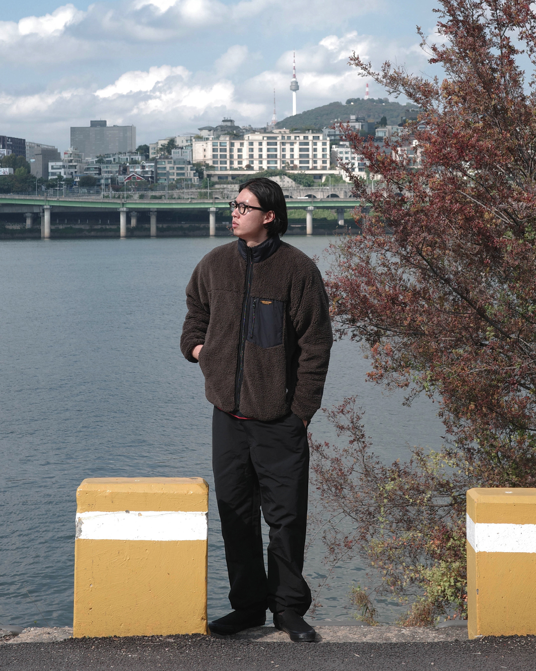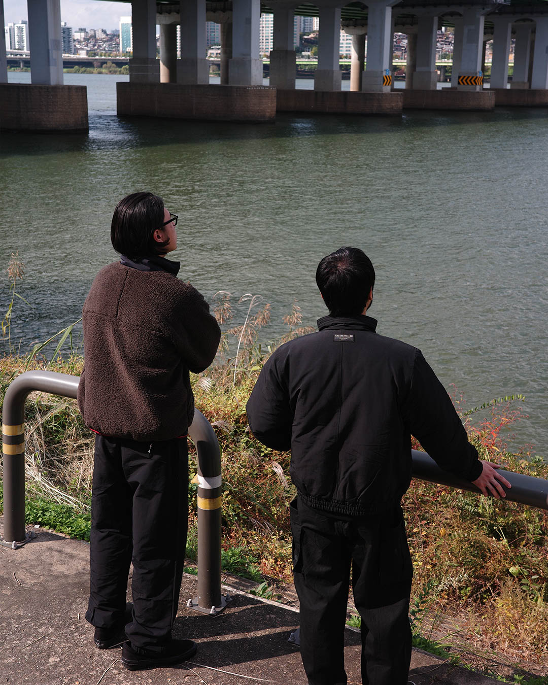 프론트에는 스냅버턴과 히든 지퍼, 바지 밑단에는 여유있게 주름을 넣은