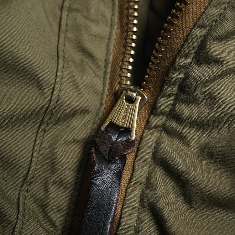 방풍성을 고려해 우측으로 오프셋한 메인 지퍼와 Dar Black® 도금 버튼을 사용한 내부 주머니,