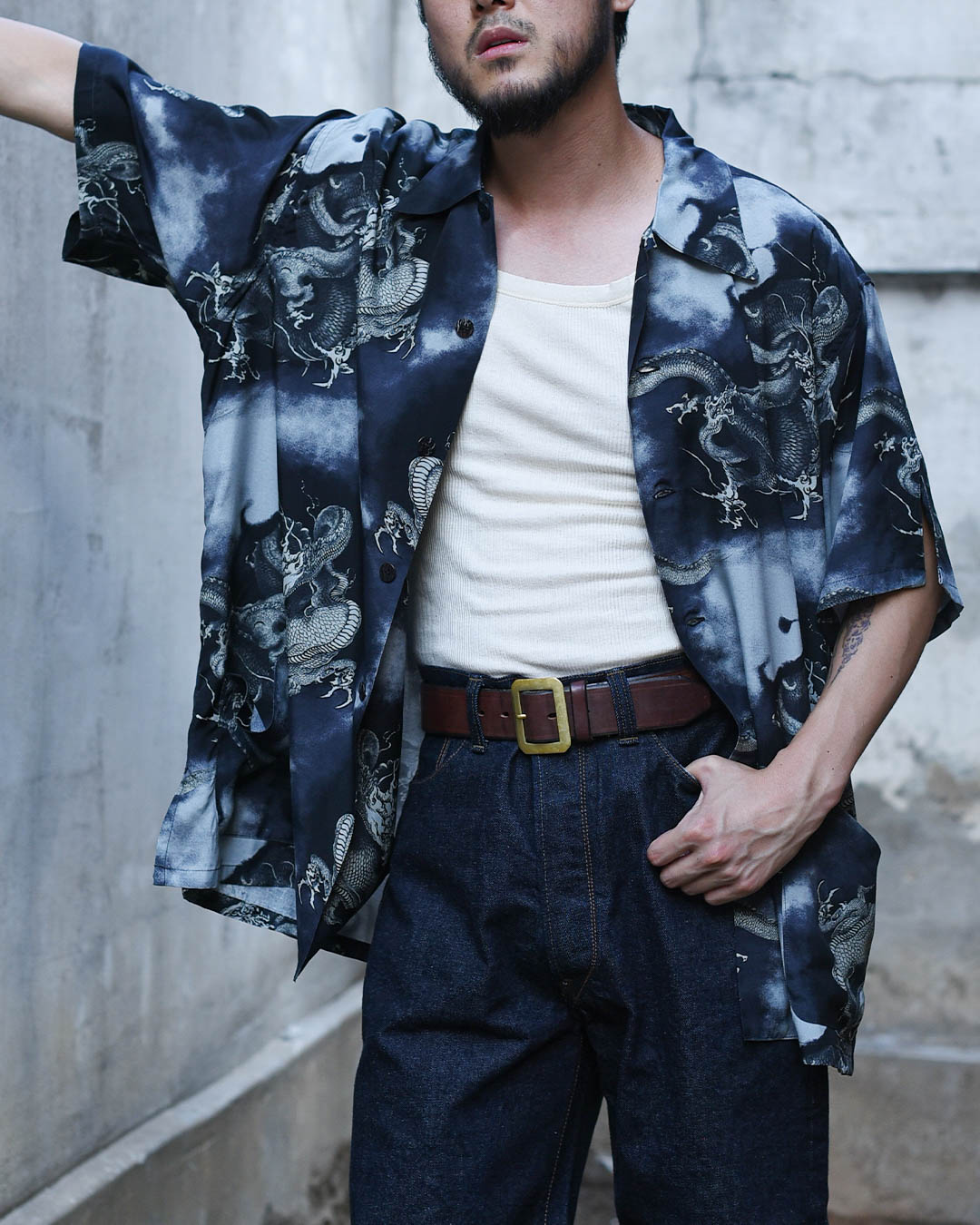 하늘 높이 종횡무진하는 용을 프린트한 레이온 셔츠