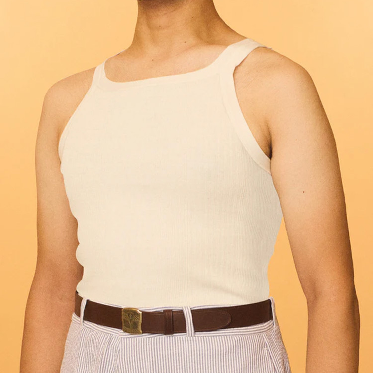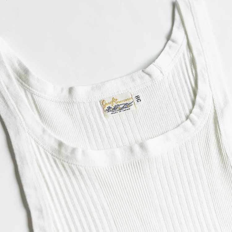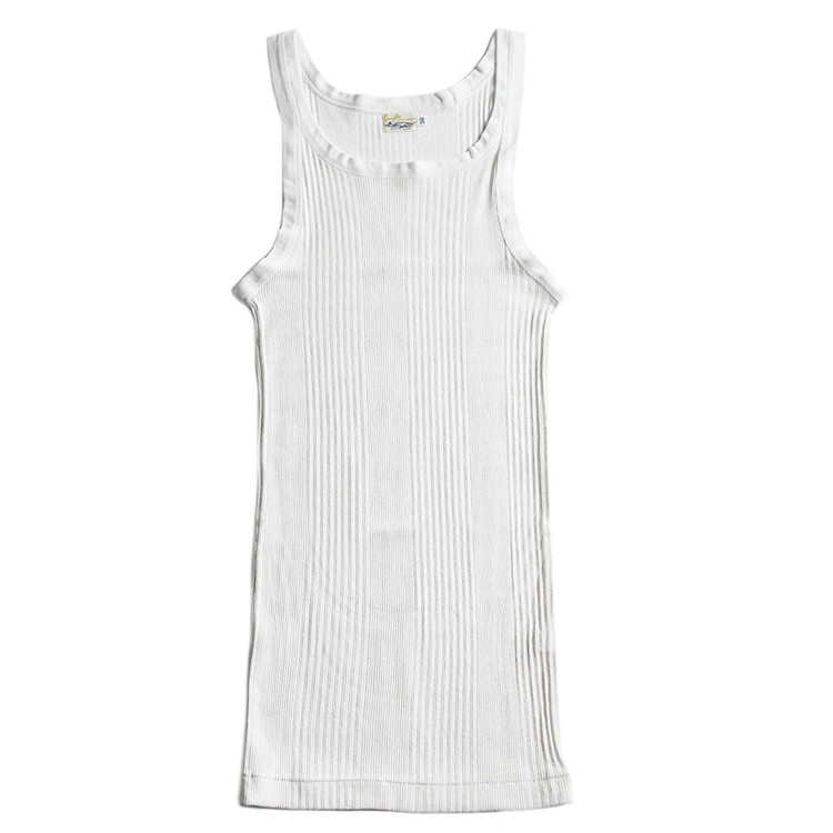 다양한 두께의 골이 랜덤하게 배열된 립 원단으로 제작된 탱크톱입니다.