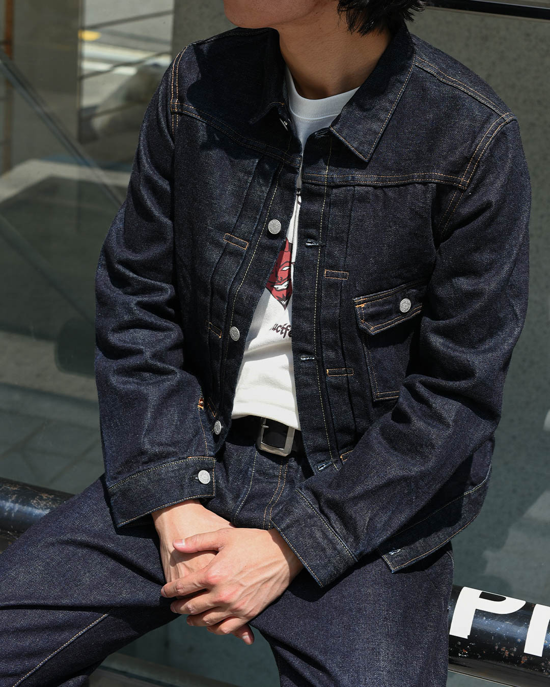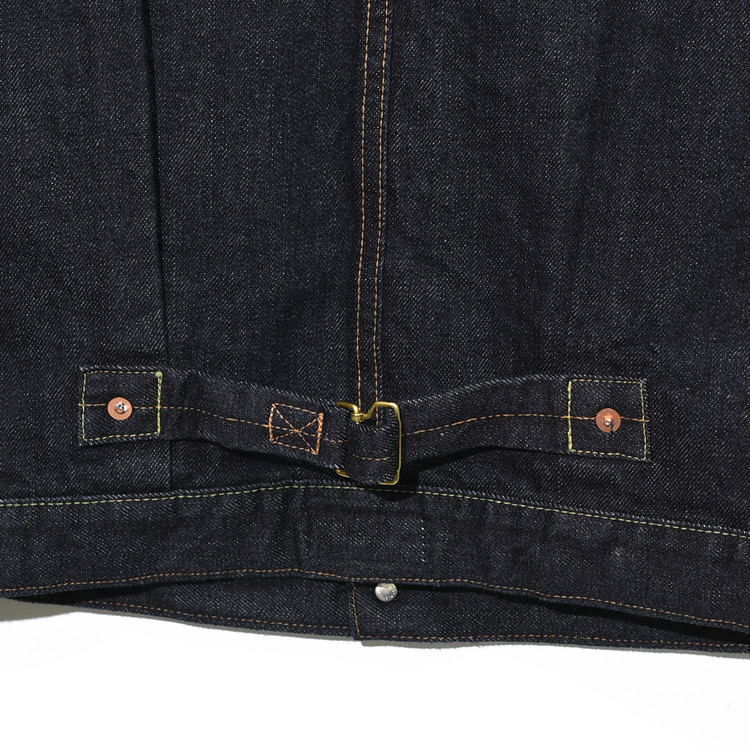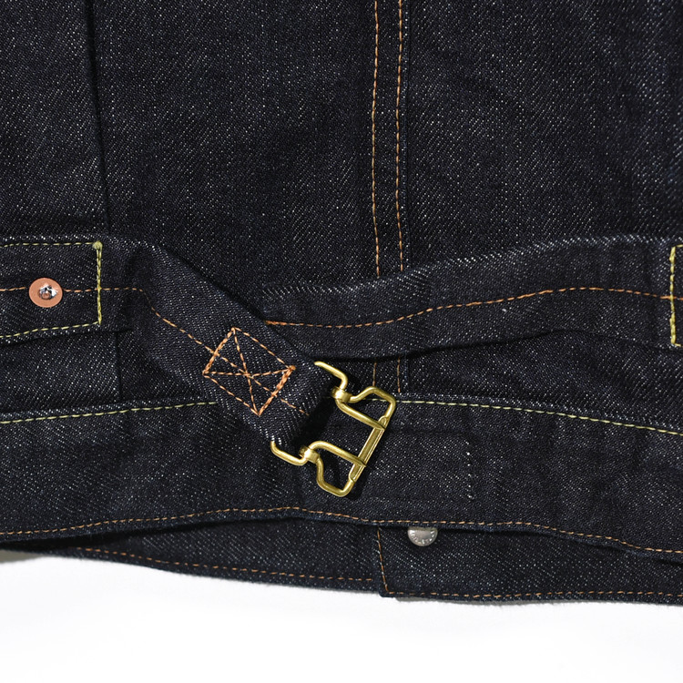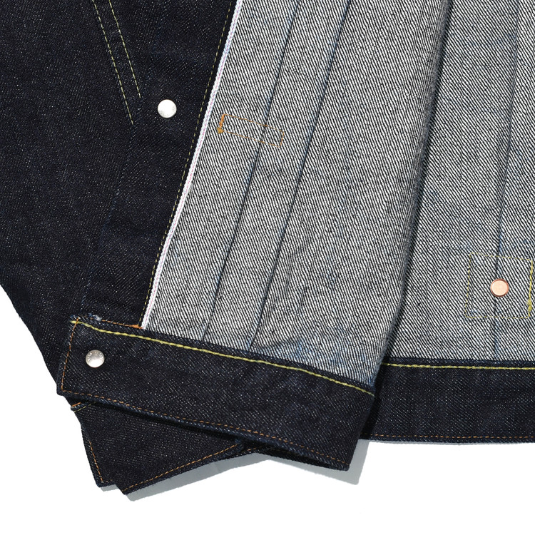 사용된 데님 원단은 13.5oz 슬러브 데님으로, 경사 7수·위사 6수의 무라(uneven)사를 사용했고
