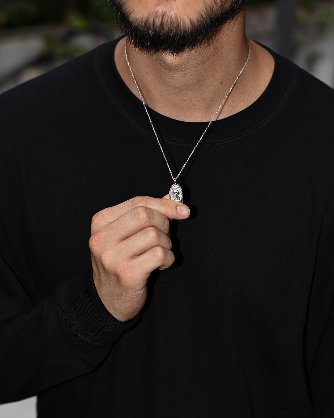 성모 마리아가 레코드를 들고 있는 독특한 디자인으로, 뒷면에는 RADIALL과 925 각인이 새겨져 있습니다.