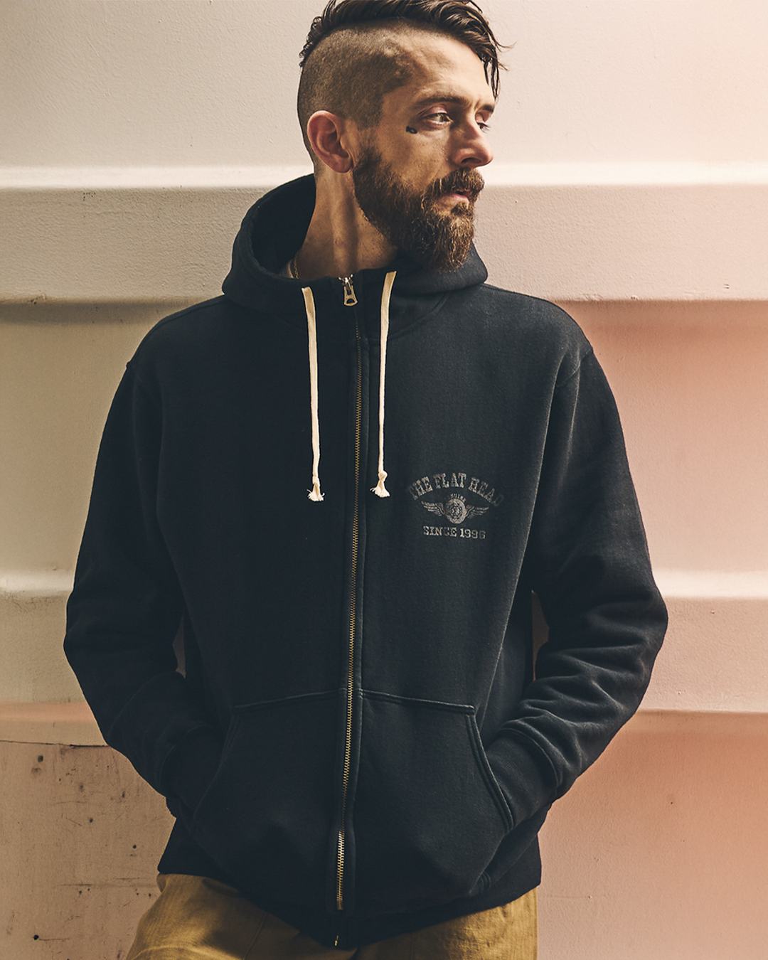 몸판 컬러마다 다른 프린트 기법을 사용해, 플랫헤드의 상징인 플라잉 휠,Flying Wheel 로고를 인쇄했습니다.