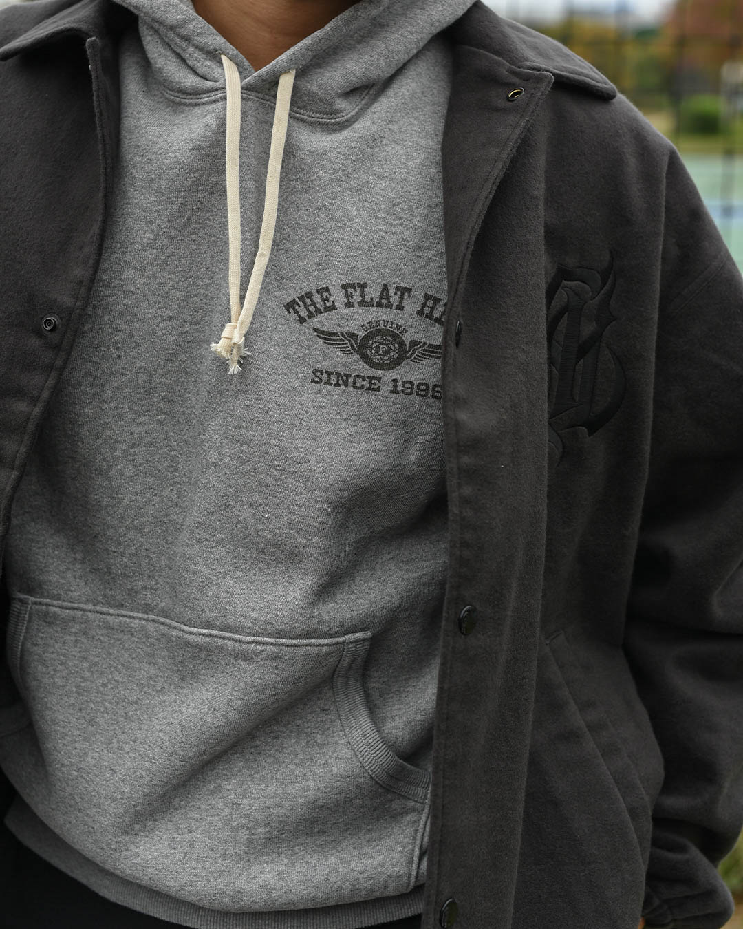 가슴 왼쪽과 등판에 브랜드의 상징인 플라잉 휠, Flying Wheel 로고가 프린트된 후디입니다.