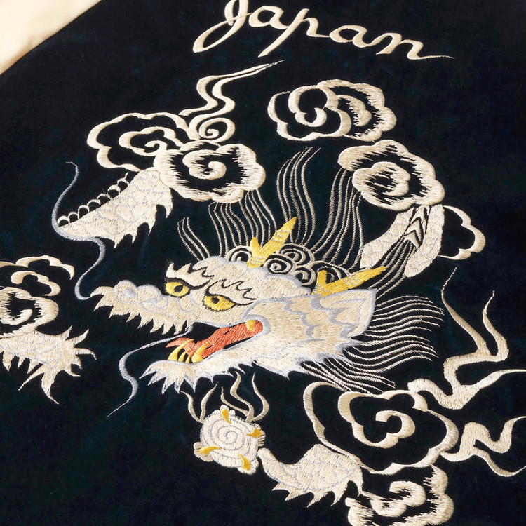 1950년대 중기 빈티지와 마찬가지로, 용의 얼굴과 비늘의 윤곽을 그레이 색실로 표현해 요코후리 자수 특유의 입체감을 강조했습니다