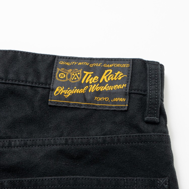 오른쪽 허리 부분에는 브랜드 네임 탭이 부착되어 있으며, 힙 포켓에는 RATS 데님의 상징인 ‘Rat 테일’ 스티치가 들어가 있습니다.