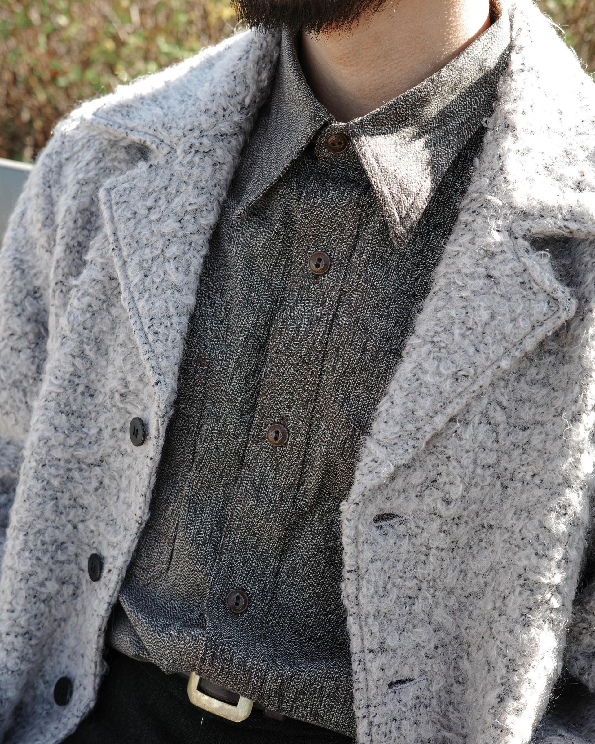 밀도가 높고 중간 두께감의 단단한 질감이 특징인 꽤나 헤비한 원단감의 셔츠입니다.