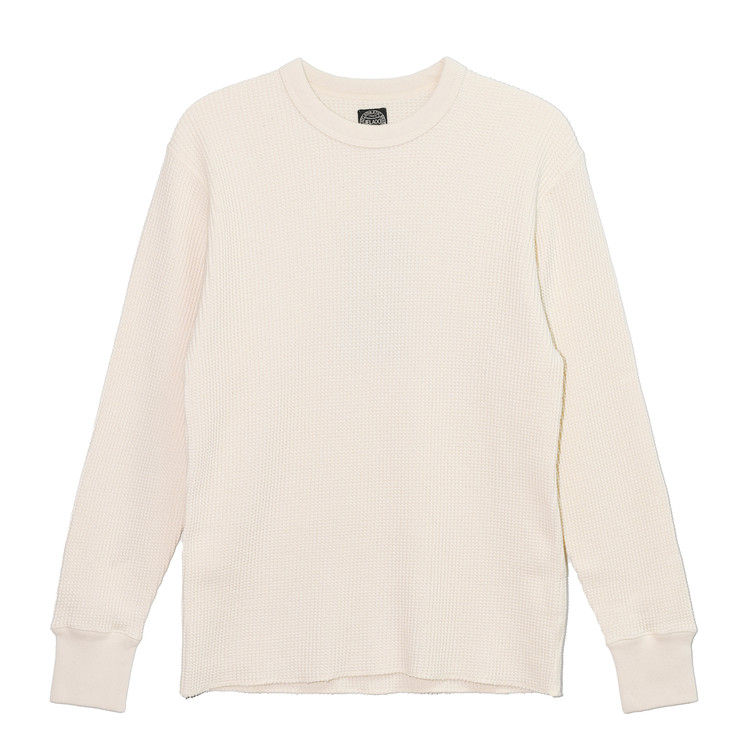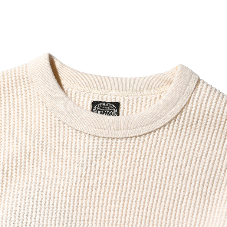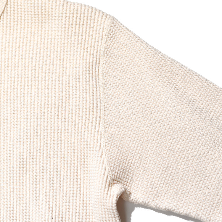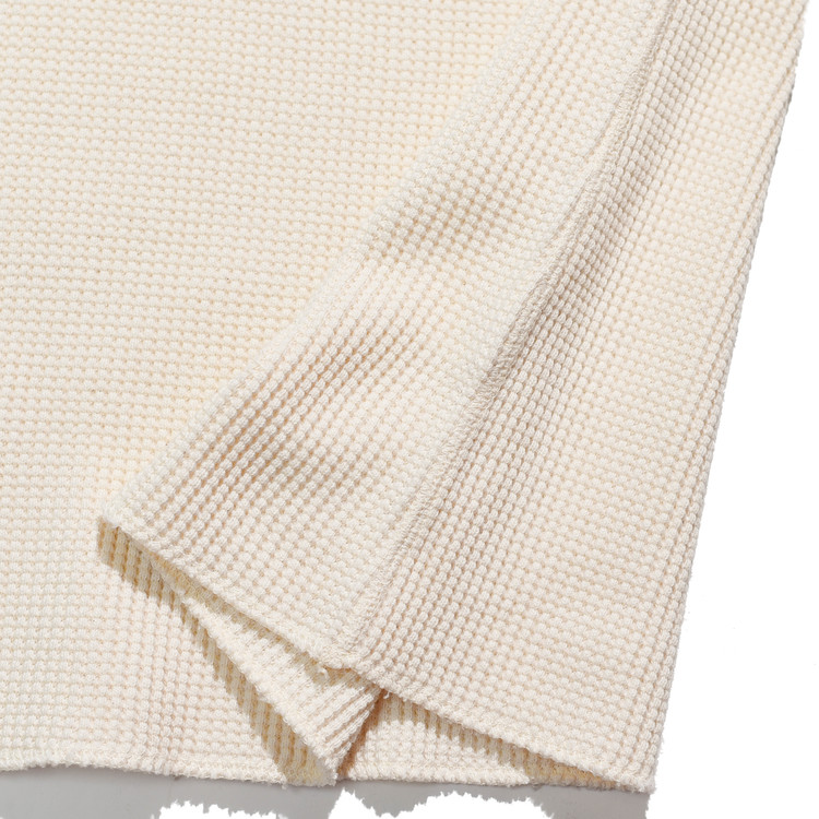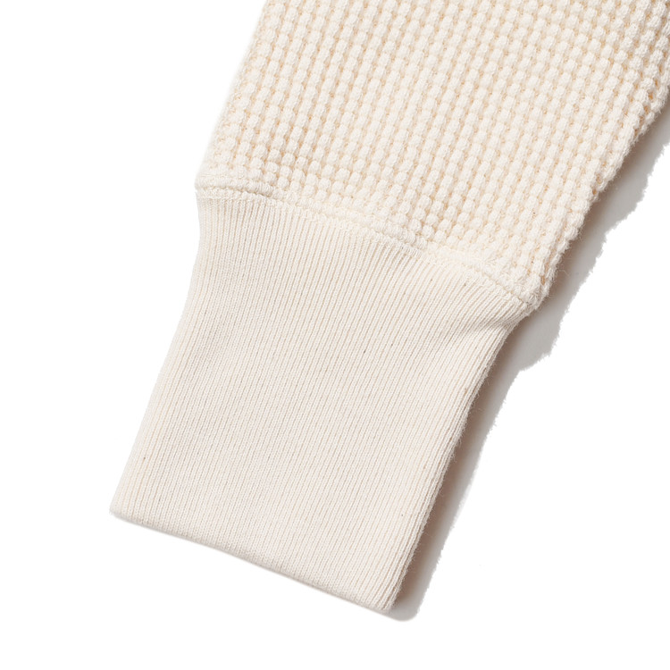 일반적인 헤비 써멀에 사용되는 30수보다 굵은 10수 실을 사용해 짜여진 원단은 크고 선명한 와플 조직이 특징이며,