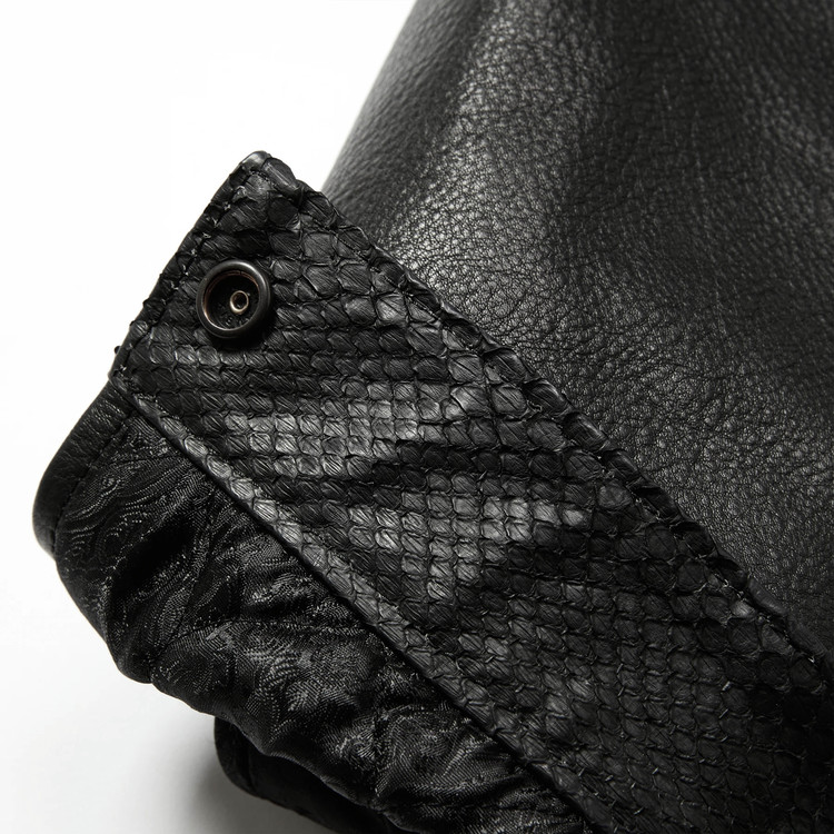 또한 카라 안쪽, 소매 안쪽, 지퍼 풀러에는 뱀가죽을 사용해 디테일을 더했습니다.