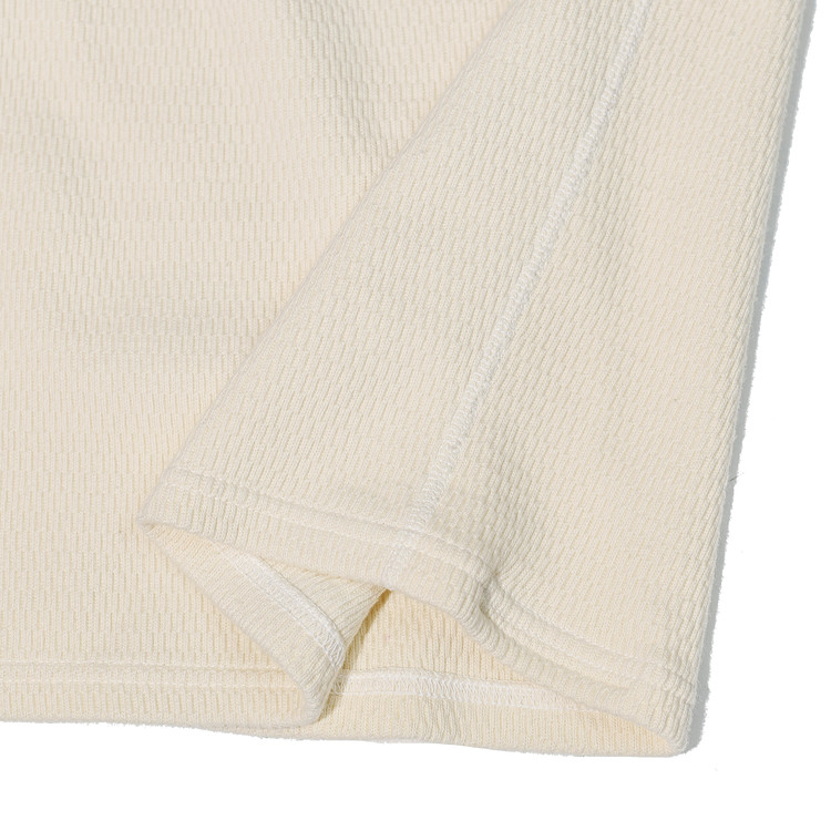 세로로 길게 이어진 허니컴 조직이 특징인 써멀 원단은 신축성이 뛰어나 착용 시 적당한 밀착감을 주며, 매우 편안한 착용감을 제공합니다.
