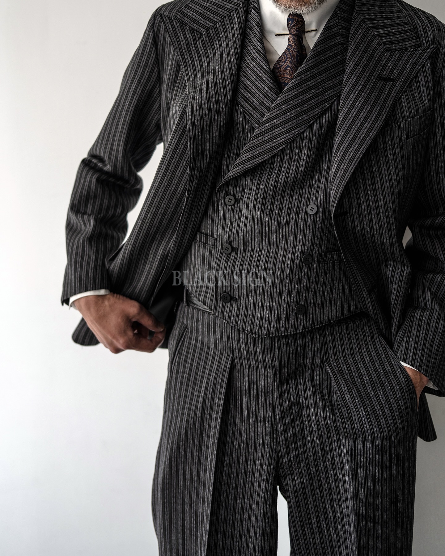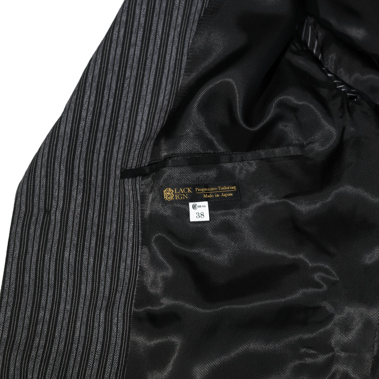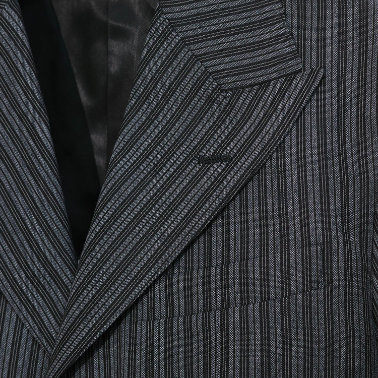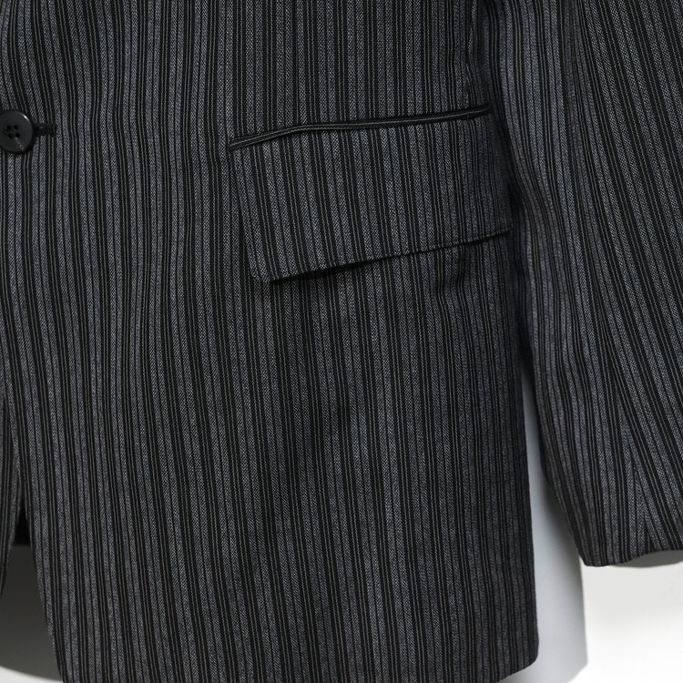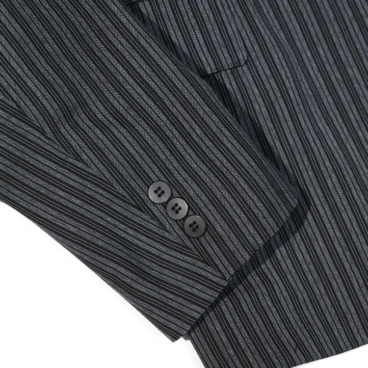 원단은 트리플 스트라이프를 굵은 번수의 실로 표현한 울 100% 원단을 사용,