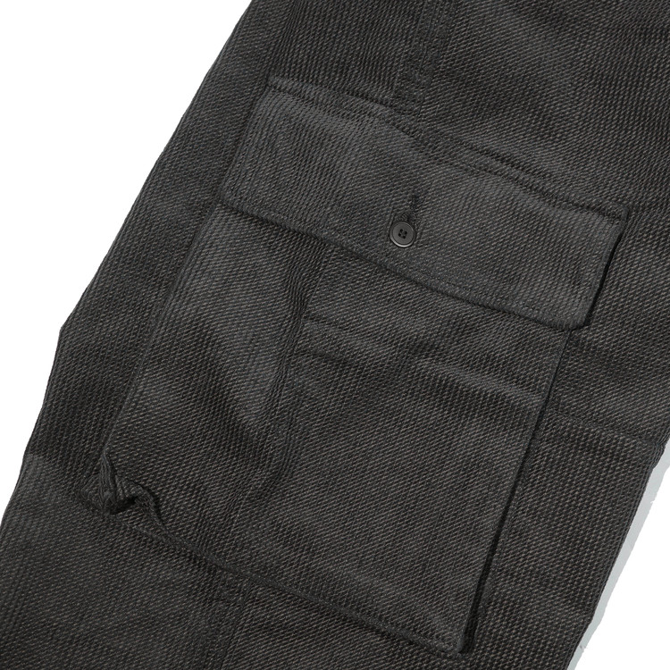 오른쪽 다리에만 배치된 대용량 거셋 사양의 사이드 포켓, 보강된 무릎 디테일 등