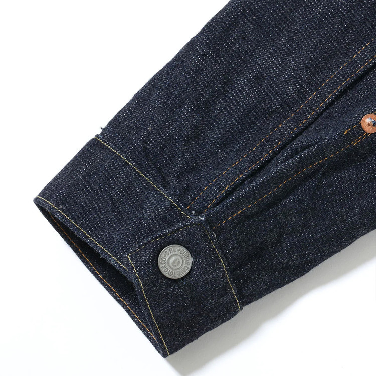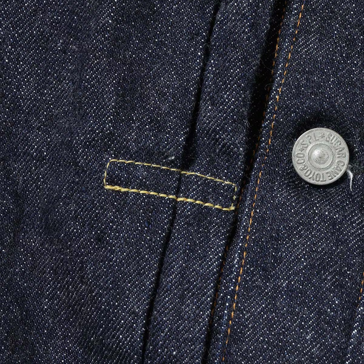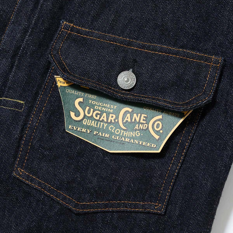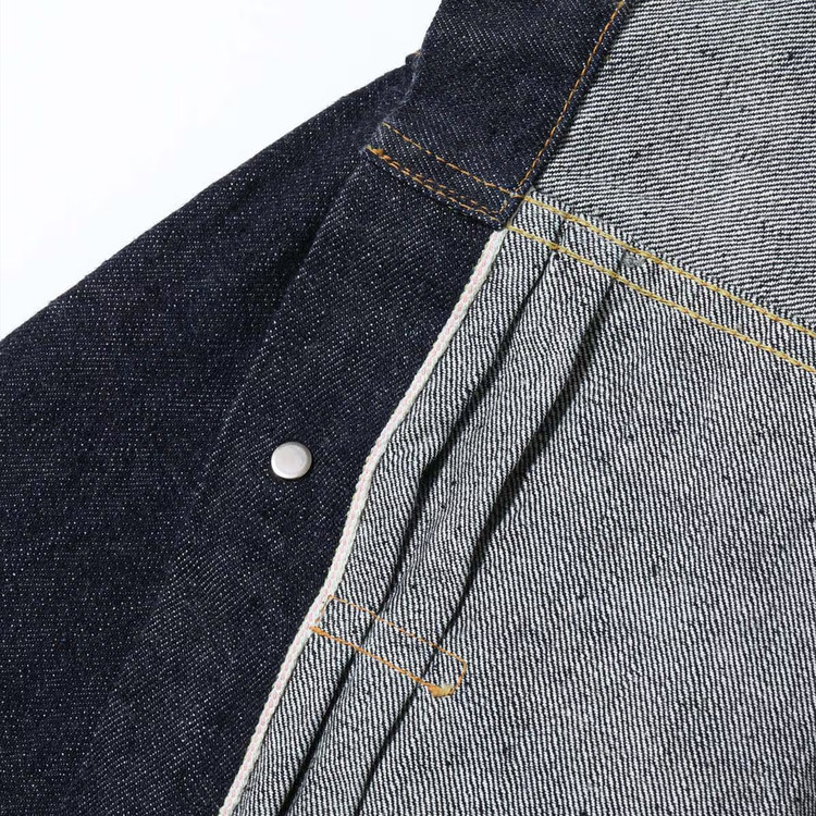 왼쪽 가슴 포켓 플랩의 안쪽에는 라이트 온스 데님을 사용했으며, 앞판 안단 끝부분에서는 셀비지 디테일을 확인할 수 있습니다.