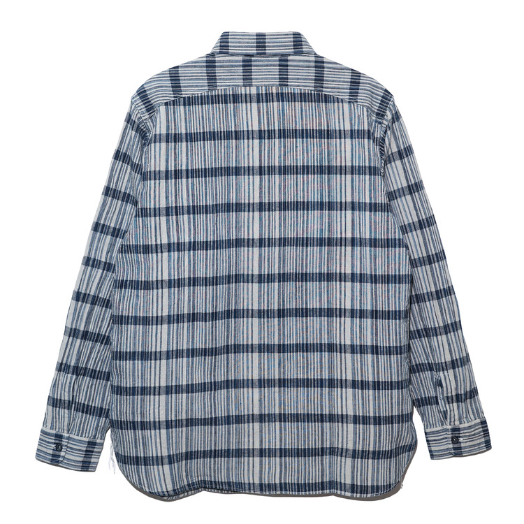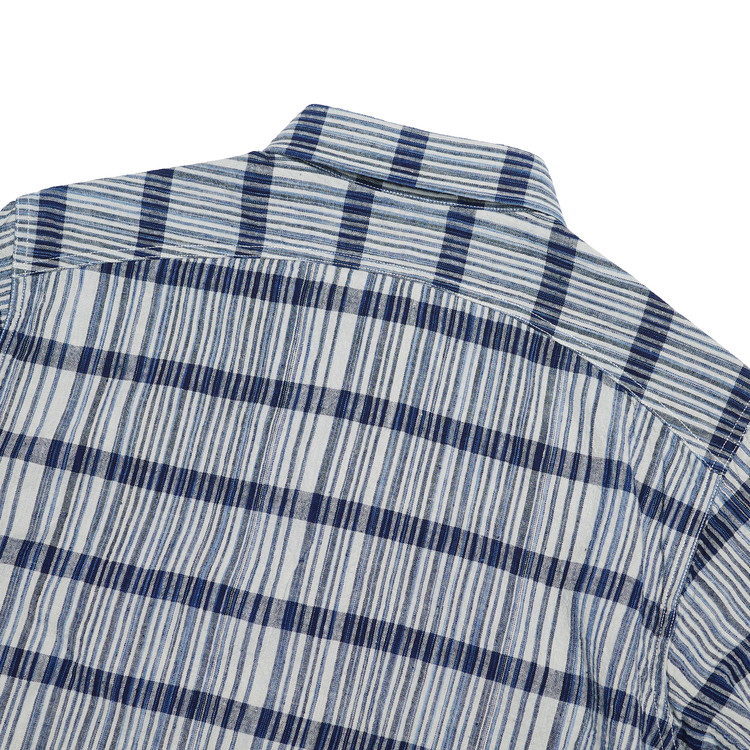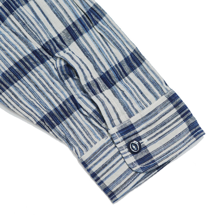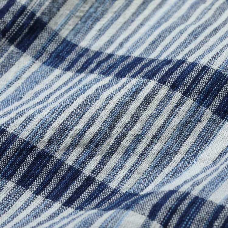 경사는 인디고 카스리를 포함한 3색, 위사는 1색으로 구성해 직사각형 격자 패턴으로 완성했습니다.