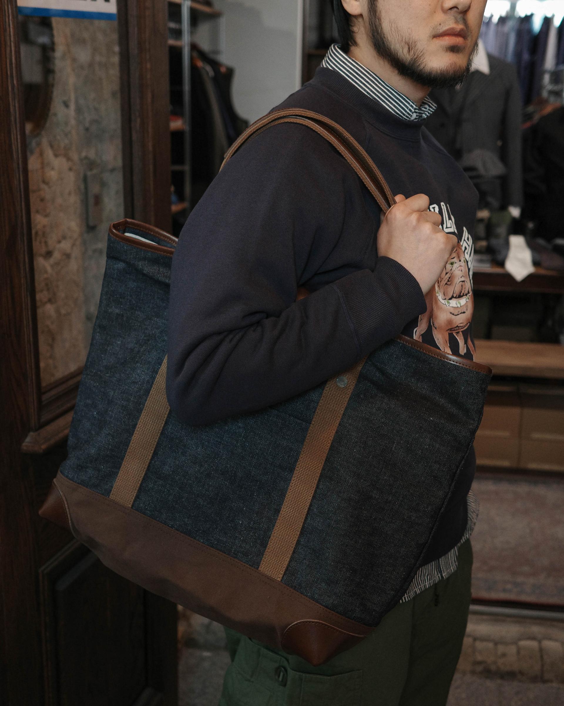 데님의 자연스러운 색 바램은 물론, 가죽의 에이징과 덕 원단의 퇴색까지 함께 즐기실 수 있는 토트백입니다.