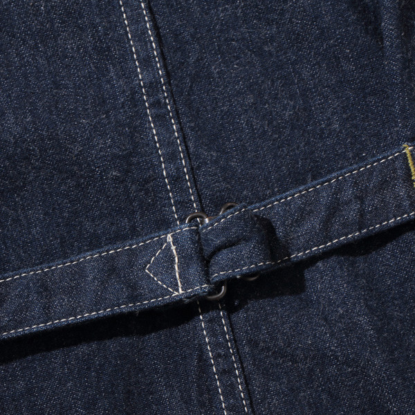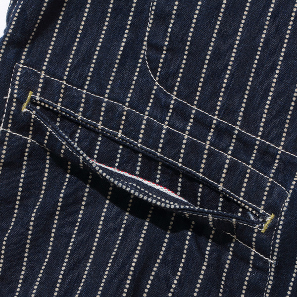 워크웨어만의 튼튼한 턱 버턴과 프론트 포켓 측면 회중시계의 체인을 고정하는 홀이 자리 잡고 있으며